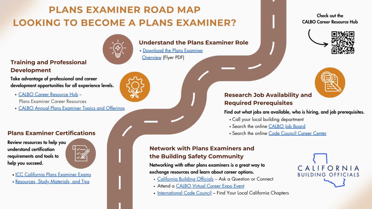 California Plans Examiner Resource Road Map Post March 5, 2026 Interested in becoming a Plans Examiner in the California building safety industry? Download this handy roadmap for a path toward success! Plans Examiner Roadmap (PDF): Click Here