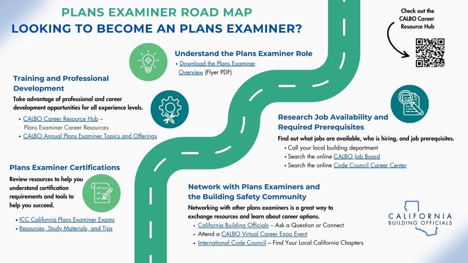 California Plans Examiner Resource Road Map Post March 5, 2026 Interested in becoming a Plans Reviewer in the California building safety industry? Download this handy roadmap for a path toward success! Plan Reviewer Roadmap (PDF): Click Here