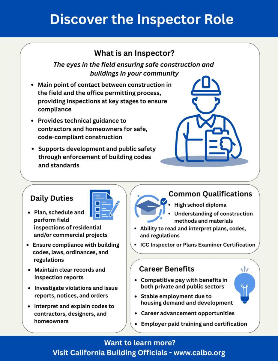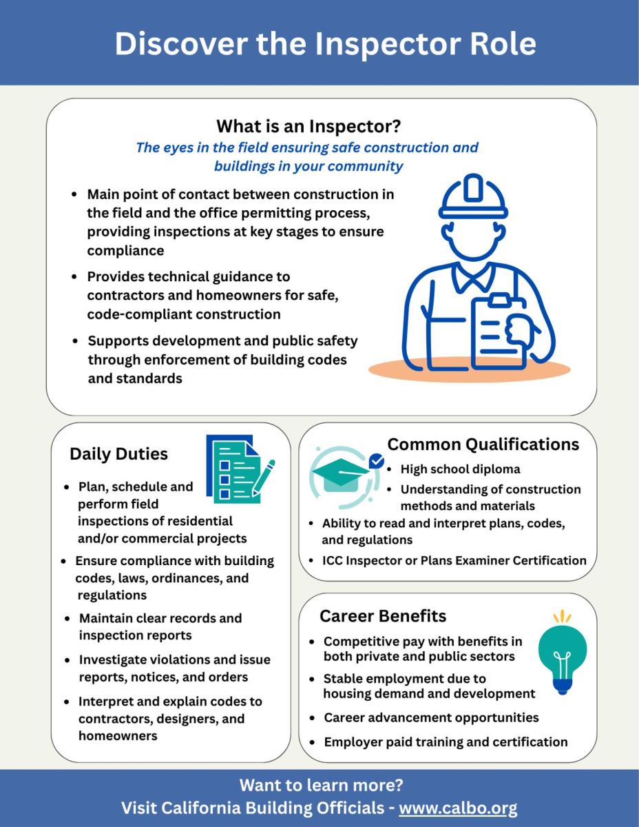 Serves as the connection between field construction and the permitting office, inspecting projects at key stages to ensure compliance