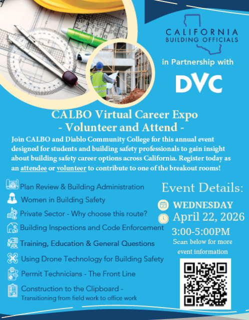 Hosted by CALBO and Diablo Valley College, join building safety professionals from across California to gain insight about building safety career options.